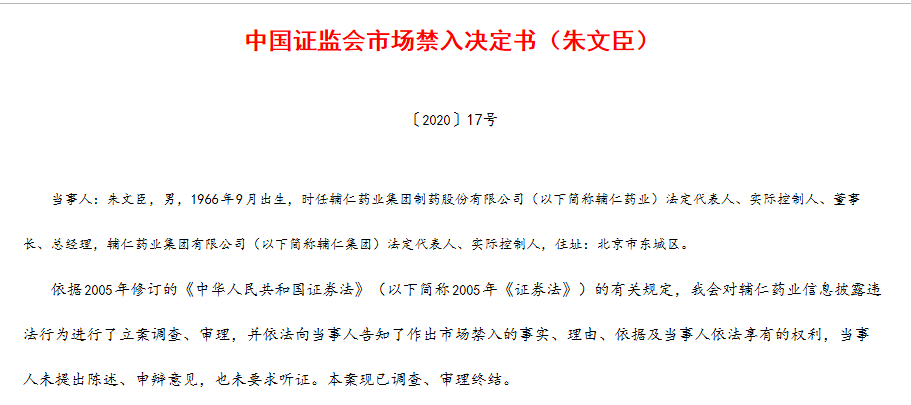 综合上述三项违法事实,合计对辅仁药业集团制药股份有限公司处以120万元罚款;对辅仁药业集团有限公司处以60万元罚款;对朱文臣处以150万元罚款;对朱成功、朱文亮、苏鸿声分别处以35万元罚款;对朱学究处以30万元罚款;对朱文玉处以25万元罚款;对赵文睿处以20万元罚款;对安慧、耿新生、李雯分别处以15万元罚款;对张海杰处以13万元罚款;对李成、贠海分别处以8万元罚款;对张雁冰处以6万元罚款。证监会同日发布市场禁入决定书,决定对朱文臣采取10年证券市场禁入措施。