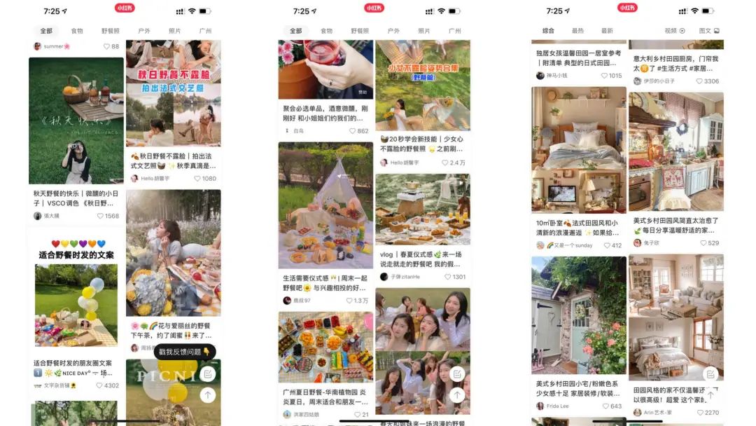 小红书上全是「野餐攻略」「居家田园风」的关键词,各个摄影/模特 Kol 教你如何选道具、摆角度、调滤镜。