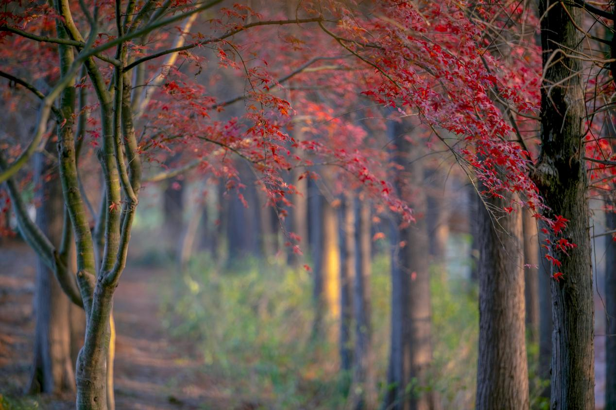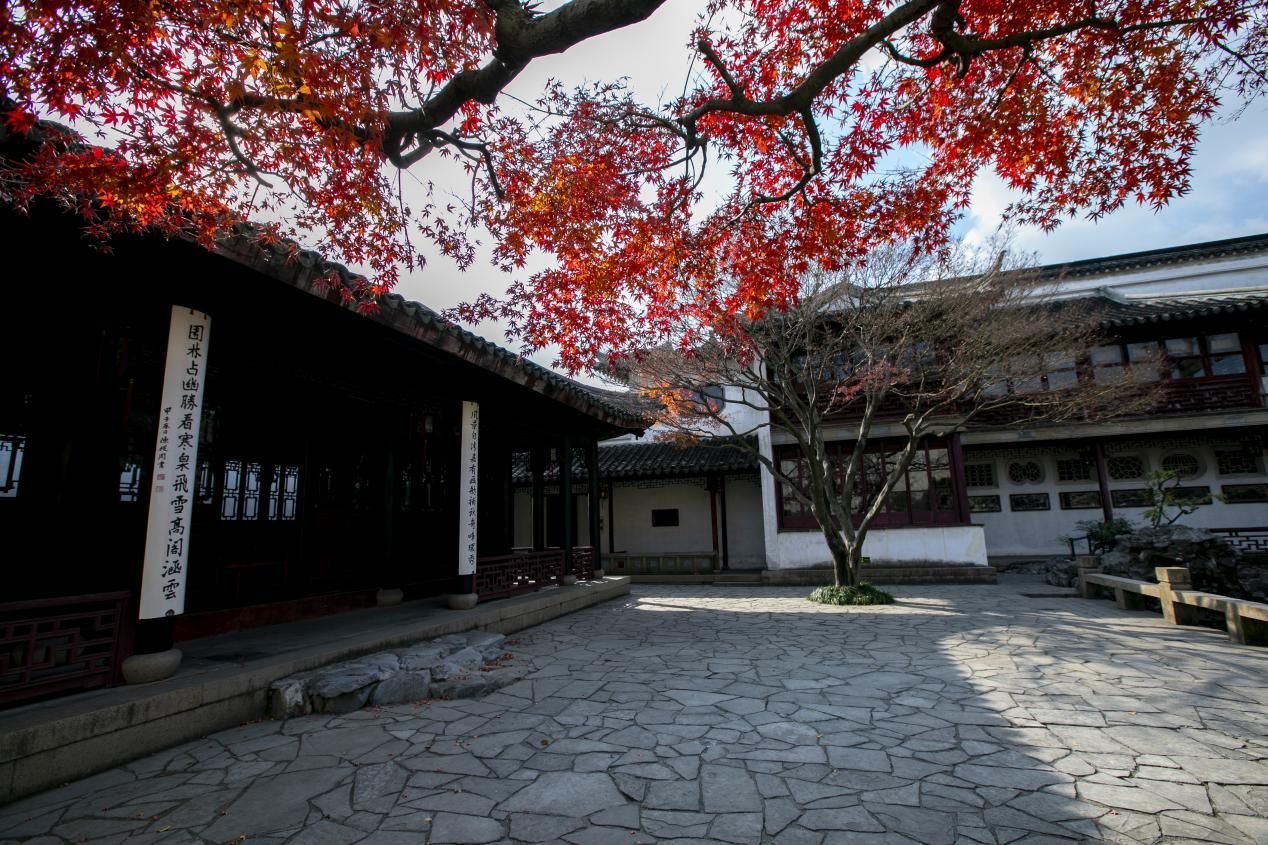 冬日的苏州,金黄的银杏叶并未尽凋,深红的枫叶“开”得正艳。春天是赏花的季节,虽然说四季都有花开,然而只有春天的花盛开之时,新叶尚未长出,没有绿叶的“抢戏”,诸花皆开得纯粹而热烈,无所顾忌。冬天是赏叶的季节,尽管叶的凋落会令人产生消逝、飘零的伤感,然而依然留在树上的彩叶,则纷纷抓住最后的时光,在阳光中尽情闪耀,在风中尽情摇摆。是的,彩叶必须在阳光之下,逆着光去赏它,那半透明的叶片如色彩的风铃,是一种通透而热烈的美。