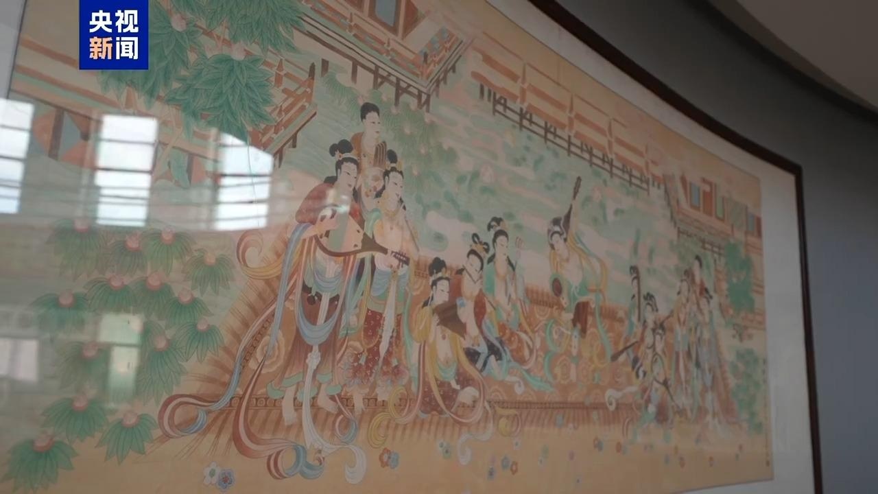 问天阁的内部,是一个圆形的中厅。这里有一个仿长城样式的楼梯,稳固厚重,寓意着中国的航天事业穿越古今、勇攀高峰。在中厅的环形墙壁上有三幅敦煌壁画,是中国人最早的飞天梦想。