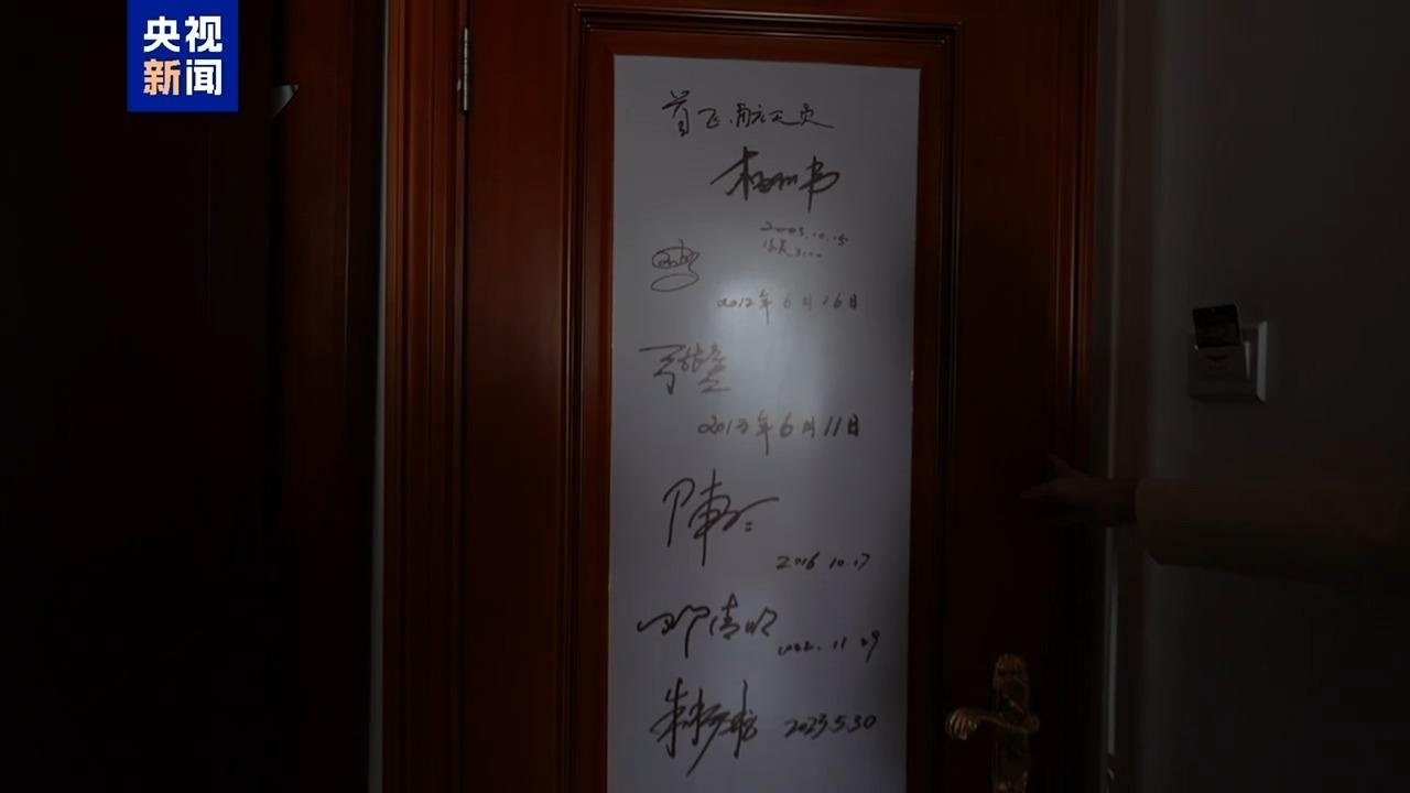 房间门后整整齐齐地签着航天员们的名字。按照惯例,航天员出征前都会在自己的房间门板上签名,这也是中国航天接续发展的最好见证。