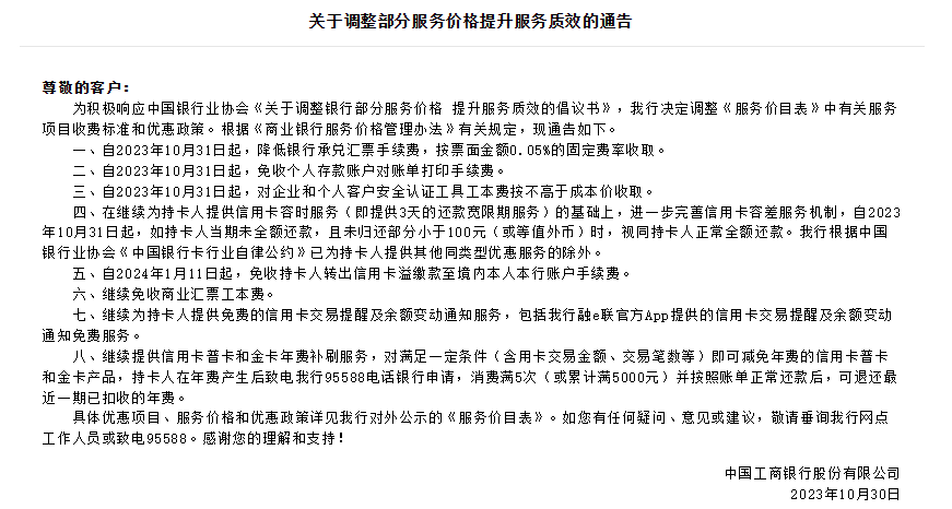 农行公告指出,自2023年10月31日起,继续为持卡人提供免费的信用卡交易提醒及余额变动通知服务;免收持卡人转出信用卡溢缴款至境内本人本行账户手续费;继续提供信用卡普卡和金卡年费补刷机制;继续提供信用卡容时、容差服务机制。