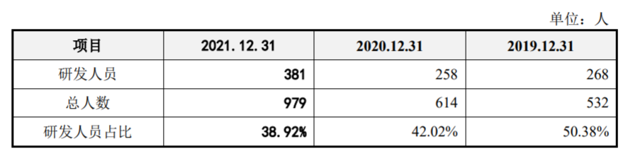 菲鹏生物的研发人员总数虽然在增加,但与总人数的占比是在下降的,2019年至2021年,研发人员占比分别为50.38%、42.02%和38.92%。