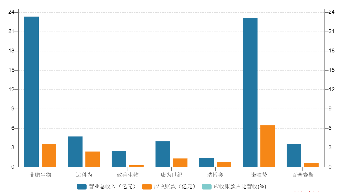 未上市企业中,菲鹏生物2021年应收账款为3.59亿元,占总营收15.39%;达科为2022年上半年应收账款2.41亿元,占总营收50.78%;致善生物2022年上半年应收账款0.28亿元,占总营收11.30%;瑞博奥2022年上半年应收账款0. 86亿元,占总营收61%。