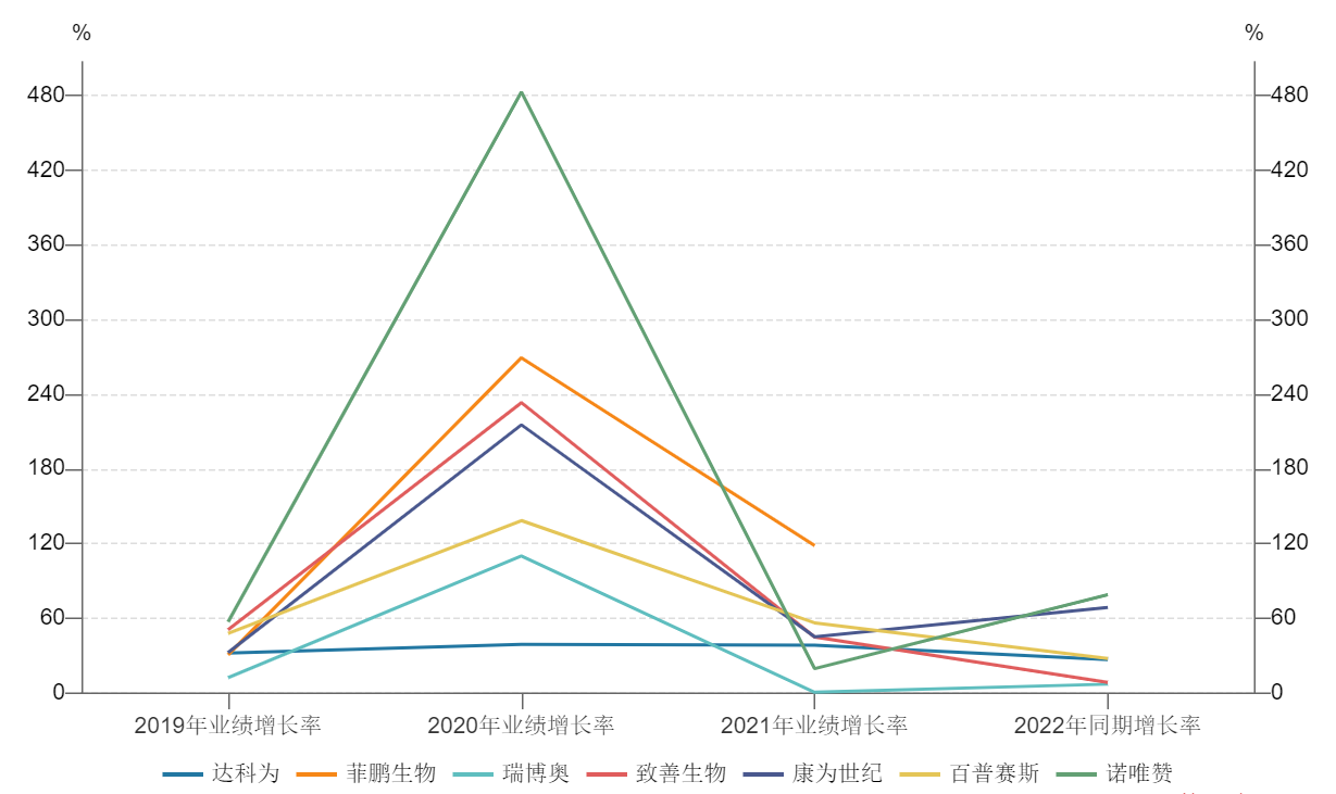 与其他核酸企业相比,瑞博奥主要在2020年出现了较大幅度增长,此后时间里增长幅度明显小于其他企业。