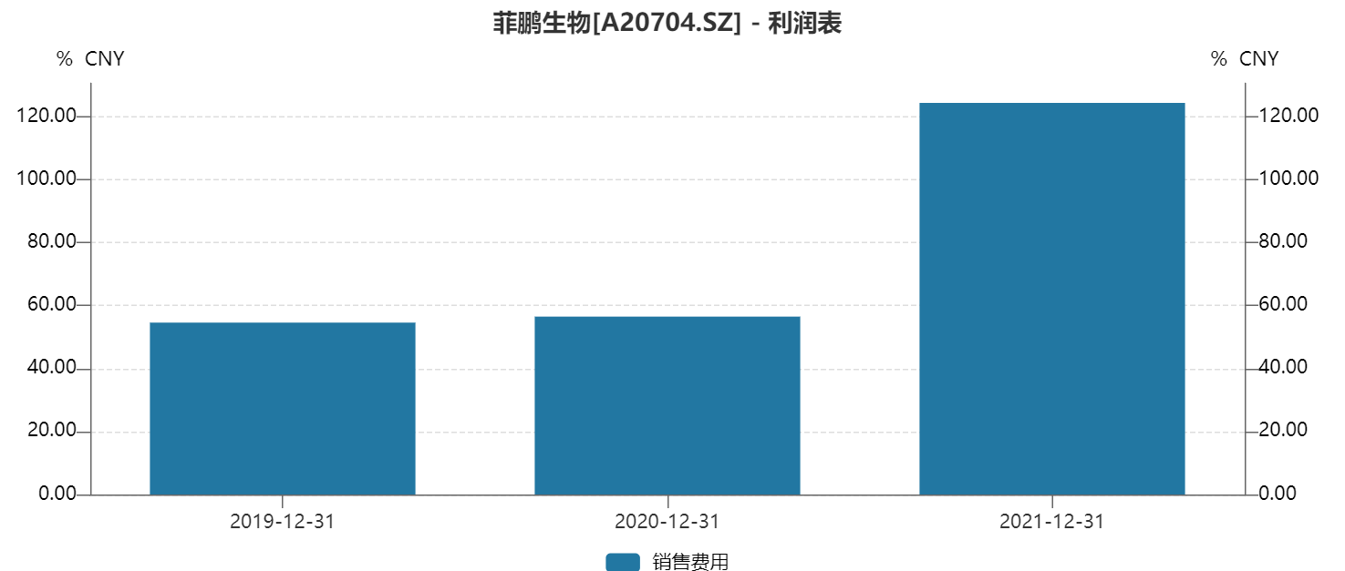 与研发费用呈鲜明对比的是销售费用,2019年至2021年,菲鹏生物的销售费用分别为0.37亿元、0.58亿元和1.3亿元,期间增长率分别为56.5%和124.37%。