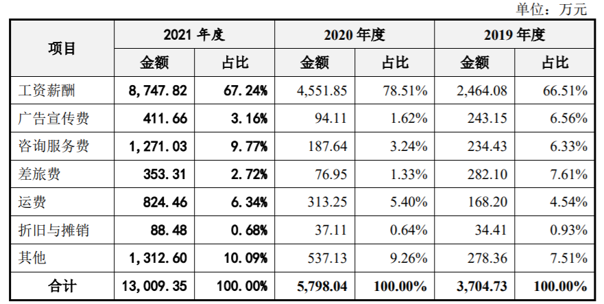 销售费用中,主要的支出在员工薪酬上,根据招股书,凤凰网财经《IPO观察哨》发现,菲鹏生物的营销员工2021年总人数为116人,这意味菲鹏生物的营销人员人均薪酬75.41万元。
