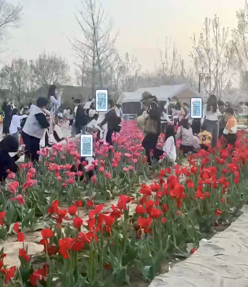午后阳光正好,为公众观赏而精心培育的郁金香花坛前,总有人肆无忌惮地踩进去。