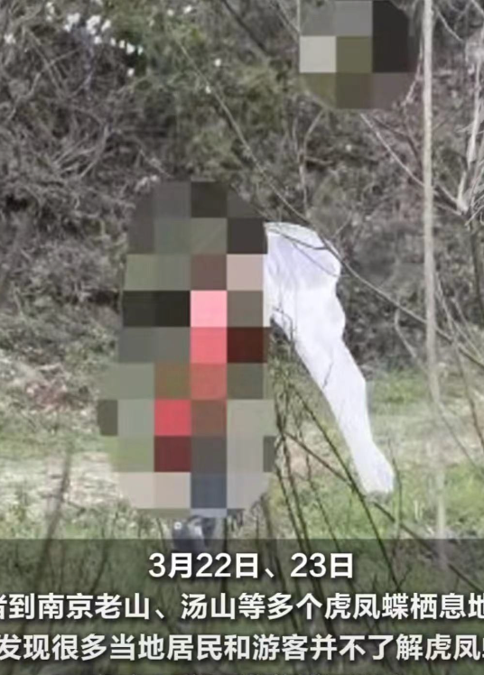 虎凤蝶作为保护动物,有无知的游客携带捕网进山,前往虎凤蝶栖息地,捕捉蝴蝶放在指尖拍照。