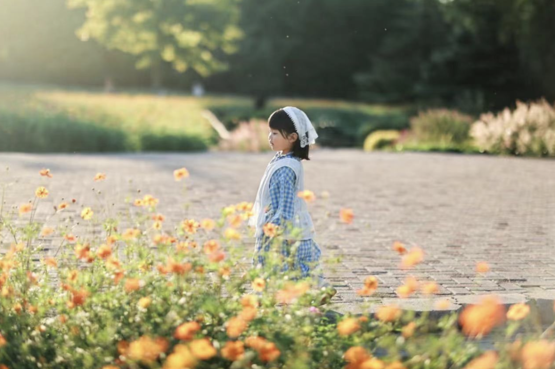 妈妈告诉孩子,只需静静站着,和花朵一样高,就能拍出好照片,不必踩进花坛。