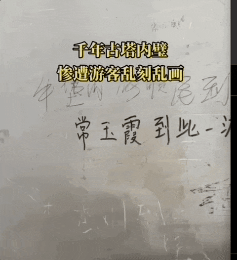 古塔的内壁上,游客们刻下“到此一游”的痕迹,斑驳的历史痕迹上,就这样覆盖了一层粗劣的涂鸦。