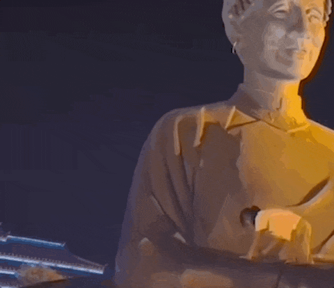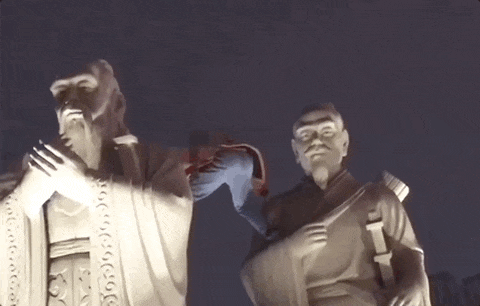 他跨坐在雕像肩头,对着镜头比出胜利手势,下面的人喊他下来,出片主角却不听劝告。