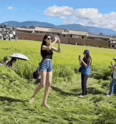 在稻田里,身着靓丽的网红博主们,径直踩上稻田拍照。