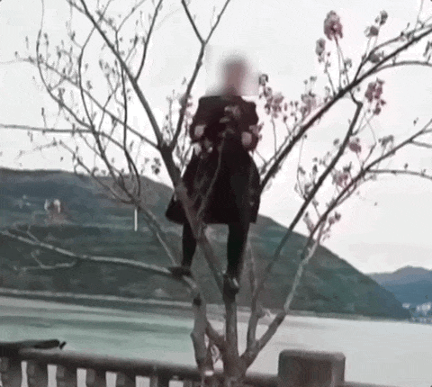 不知何时起,花瓣已经满足不了这些人的拍照欲望,他们开始爬上树木,摆弄花枝。