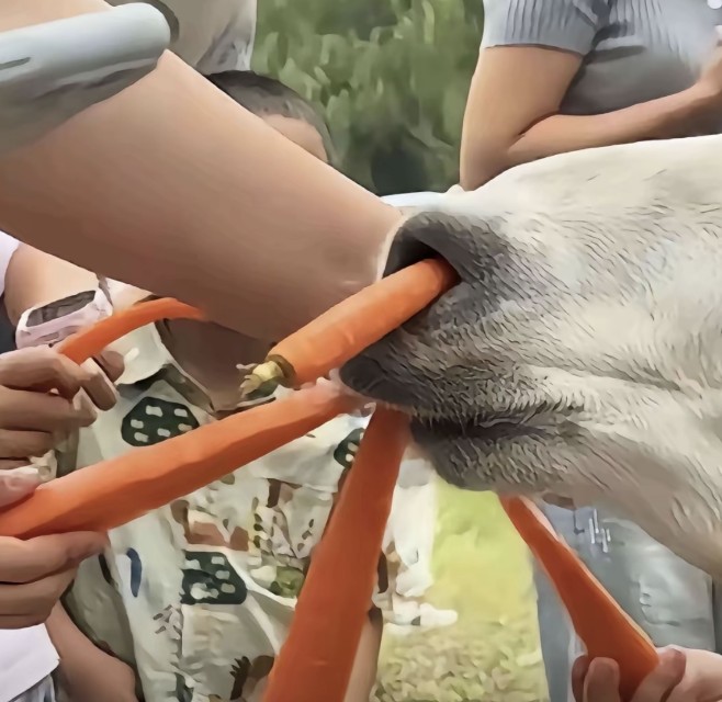 有人将手中的菜叶、胡萝卜放在动物头上,再与它们合影,拍下“滑稽”的一幕。