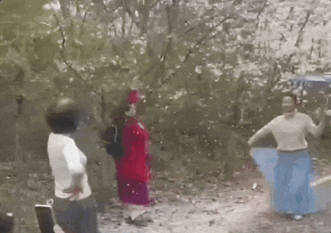 镜头里,花瓣飘落,自己拿着油纸伞翩翩起舞。镜头外,却有人用力摇晃着树木。