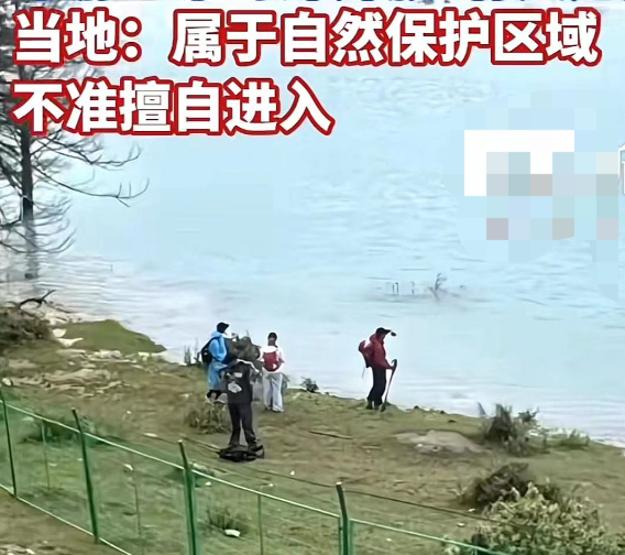 在位于自然保护区的湖泊旁,有人为了寻找独特机位,无视“禁止入内”的警示,翻越围栏,踏入湖中。