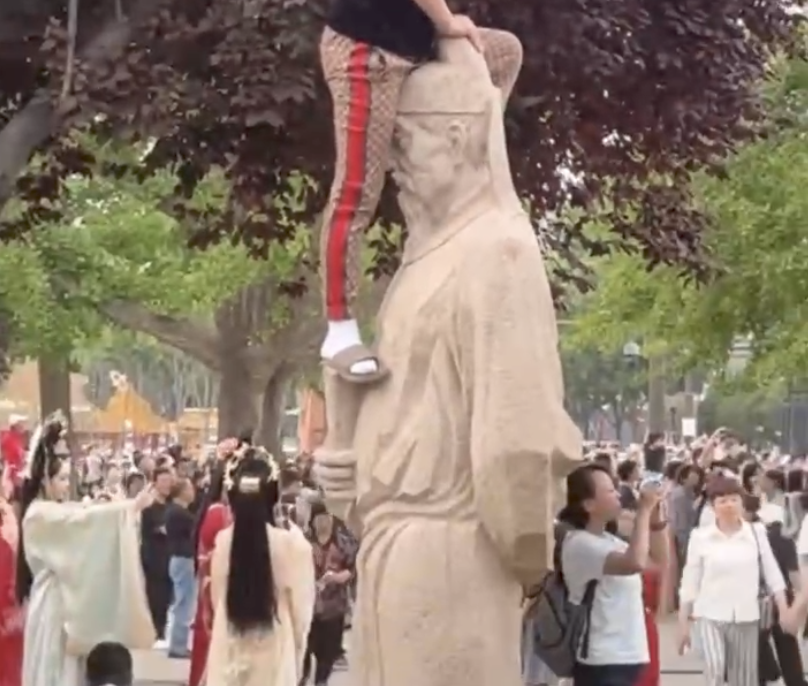 景区广场上,一尊孔子雕像上,有人踩着浮雕花纹向上攀爬。