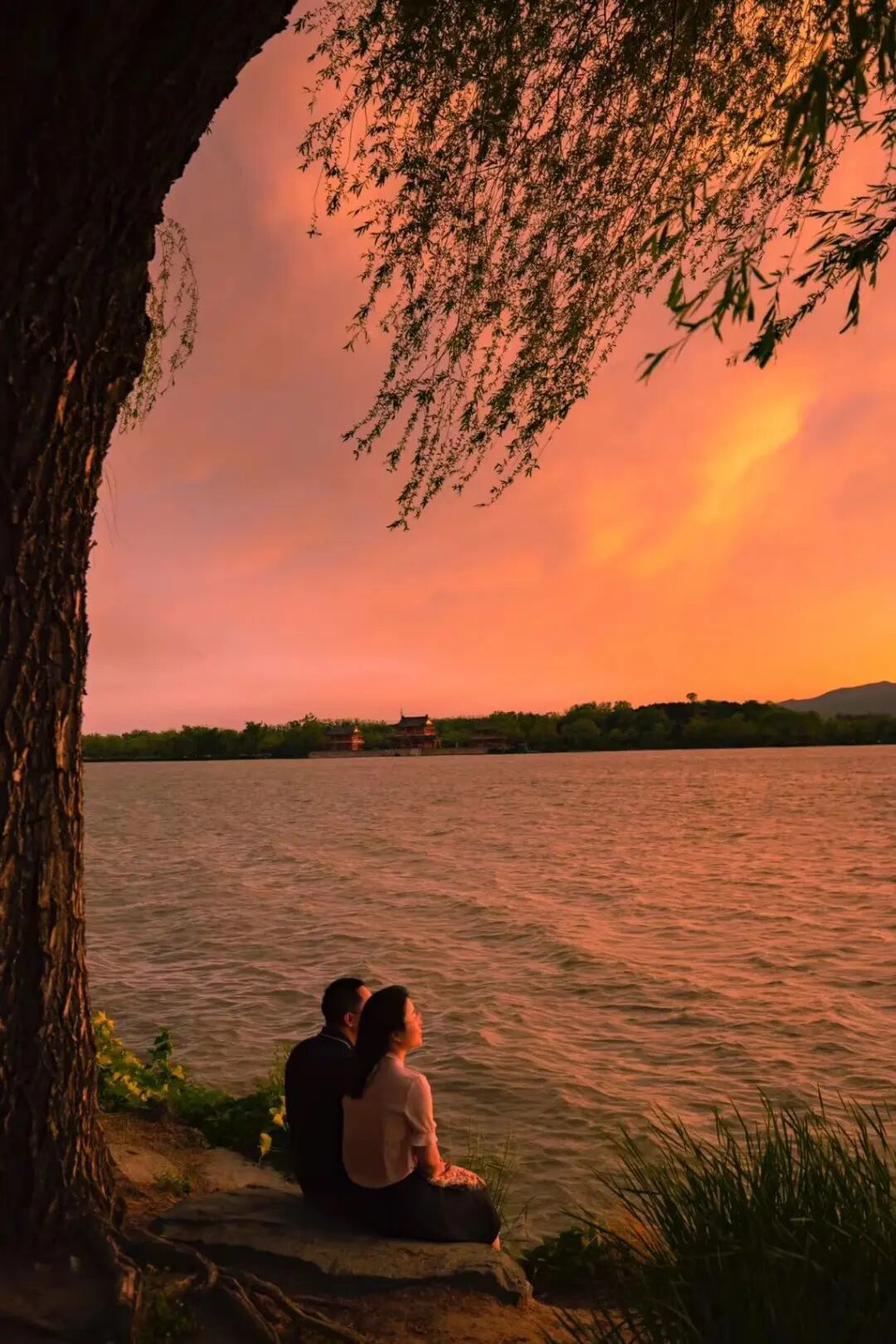 在秋日约会的情侣发现,湖泊倒映的晚霞,比起费尽心思制造的氛围更美——大自然,本就是最好的调色师。