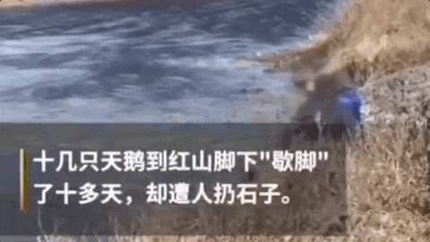红山脚下,天鹅湖旁,有人为了拍下天鹅飞翔与落地的画面,拿起石子砸向天鹅。