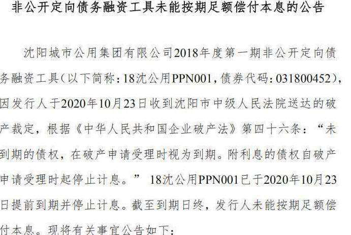 总结一下,18沈公用PPN001这只债未能按时兑付。原因是发行人已在申请破产,按法律规定,自破产申请被受理时开始,债权将提前到期并停止计息。
