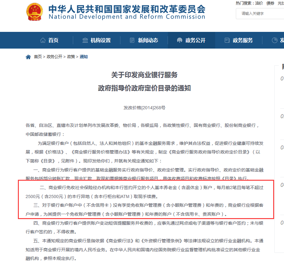 2014年2月14日,国家发展改革委、中国银监会联合下发了《关于印发商业银行服务政府指导价政府定价目录的通知》(发改价格〔2014〕268号),公布了商业银行服务实行政府指导价、政府定价的目录,降低和调整了部分收费标准,规定了部分免费服务项目。