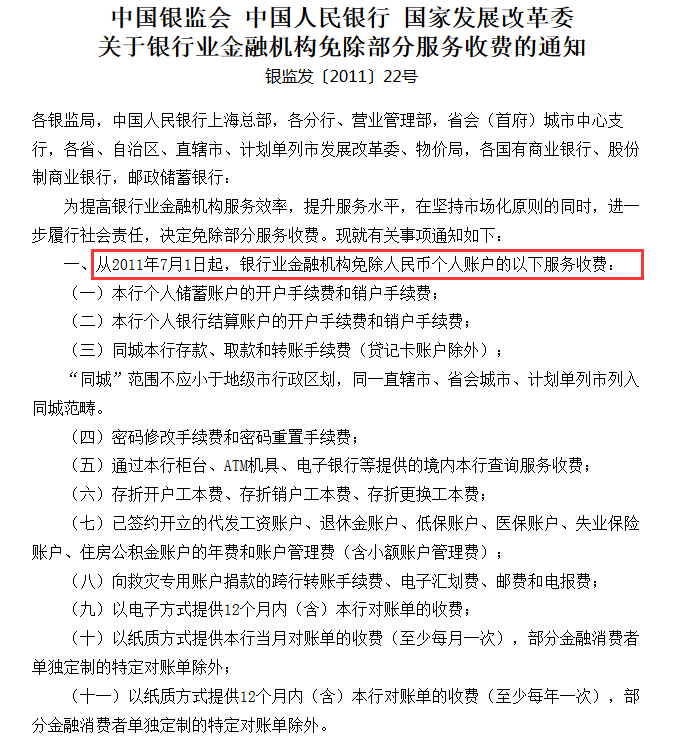 如上所述,2011年《中国银监会、中国人民银行、国家发展改革委关于银行业金融机构免除部分服务收费的通知》(银监发〔2011〕22号),就推出了银行业一些免费政策。