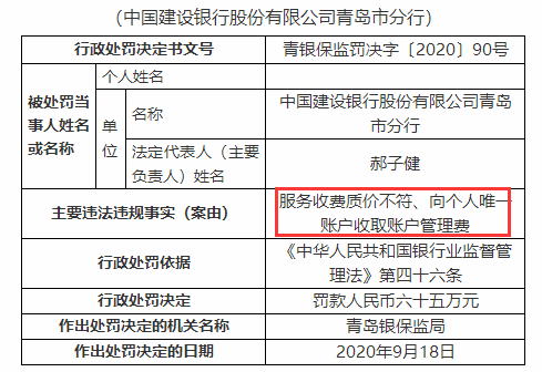 今年9月据银保监会官网消息,青岛银保监局行政处罚信息中国建设银行股份有限公司青岛市分行因服务收费质价不符、向个人唯一账户收取账户管理费,违反《《中华人民共和国银行业监督管理法》第四十六条,青岛银保监局对其罚款65万元。