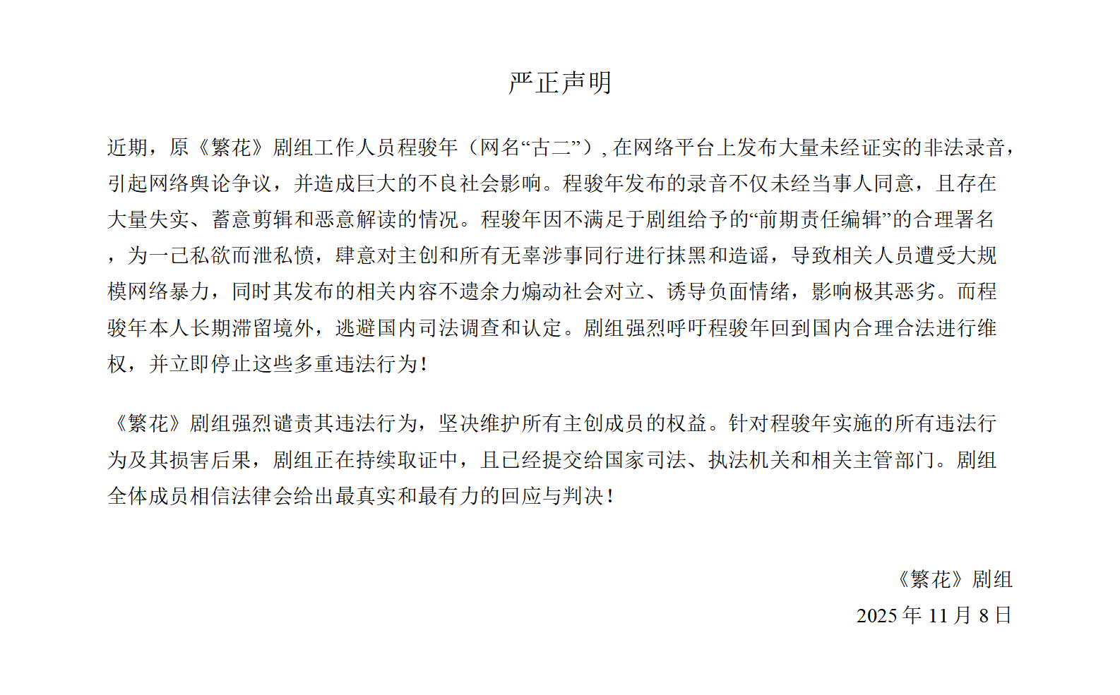 近期,原《繁花》剧组工作人员程骏年(网名“古二”),在网络平台上发布大量未经证实的非法录音引起网络舆论争议,并造成巨大的不良社会影响。程骏年发布的录音不仅未经当事人同意,且存在大量失实、蓄意剪辑和恶意解读的情况。程骏年因不满足于剧组给予的“前期责任编辑”的合理署名,为一己私欲而泄私愤,肆意对主创和所有无辜涉事同行进行抹黑和造谣,导致相关人员遭受大规模网络暴力,同时其发布的相关内容不遗余力煽动社会对立、诱导负面情绪,影响极其恶劣。而程骏年本人长期滞留境外,逃避国内司法调查和认定。剧组强烈呼吁程骏年回到国内合理合法进行维权,并立即停止这些多重违法行为!