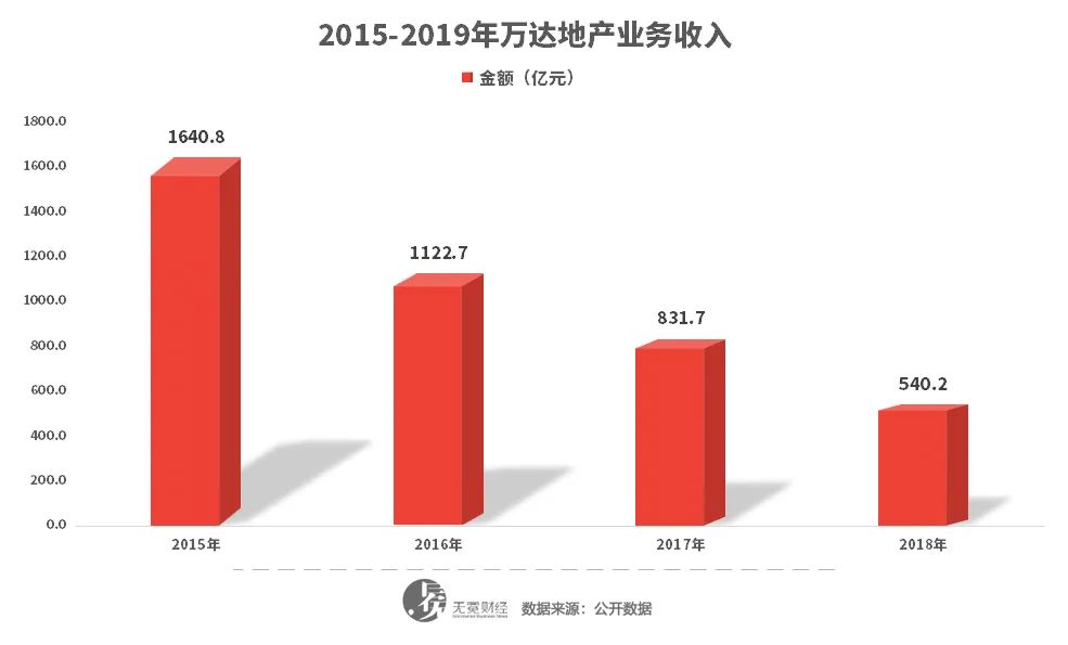 据无冕财经统计显示,自2015年,王健林提出万达5年内去房地产化的小目标伊始,万达地产规模逐年收紧。直至2018年,其地产业务收入达540.2亿元,完成年计划的102.5%,同比减少3.3%。但在2019年至今,万达集团并未如期公布具体业绩情况。