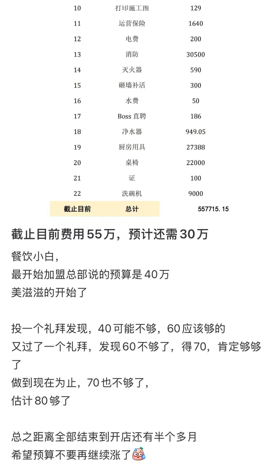 只不过创业路上充满不确定性,加盟之前总部说好的40万落地,开业时却发现实际花销高达85万;开业前总部信誓旦旦说过的日营业额过万,实际日流水可能只有几百......