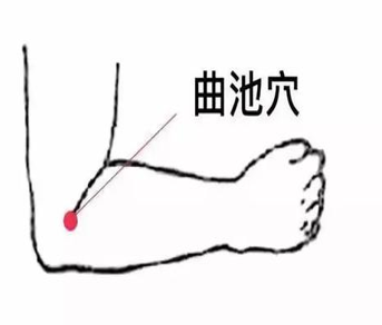 曲池穴:屈肘成直角,在肘横纹外侧端与肱骨外上髁连线中点。