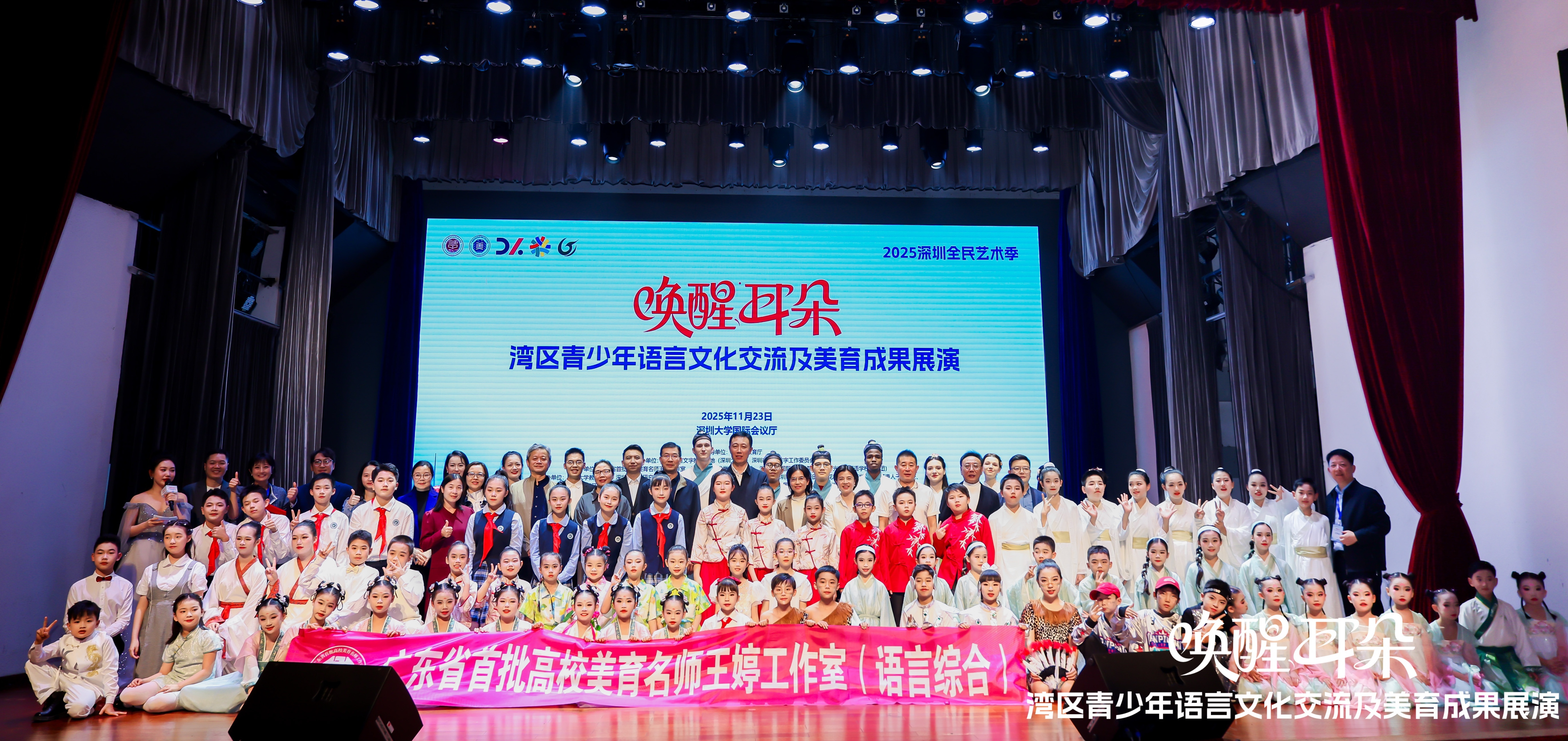 2025年11月23日下午,由广东省教育厅指导,国家语言文字推广基地(深圳大学)、深圳市语言文字工作委员会办公室共同主办,广东省首批高校美育名师王婷工作室、深圳大学艺术学部美育中心、深圳大学国际交流学院、深圳市光明外国语学校(集团)联合承办的“唤醒耳朵:湾区青少年语言文化交流及美育成果展演”在深圳大学国际会议厅成功举行。来自湾区12组青少年团体,包括3所香港学校、15个国家的在深留学生,共201名参演师生齐聚一堂,呈现了一场以语言为媒介,融合多种艺术表现手段的文化交流盛宴。