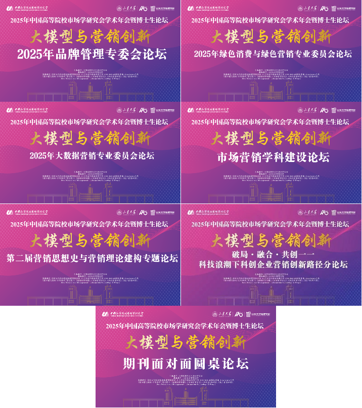 2025年中国高等院校市场学研究会学术年会暨博士生论坛设置了品牌管理专委会论坛、绿色消费与绿色营销专业委员会论坛、大数据营销专业委员会论坛共3个专委会论坛,由二十余位学者围绕不同主题进行报告分享与专题研讨。同时开设市场营销学科建设论坛、营销思想史研究与营销理论建构专题论坛、破局·融合·共创——科技浪潮下科创企业营销创新路径分论坛、期刊面对面圆桌论坛共4个特色论坛,为学者们搭建思维碰撞的平台。