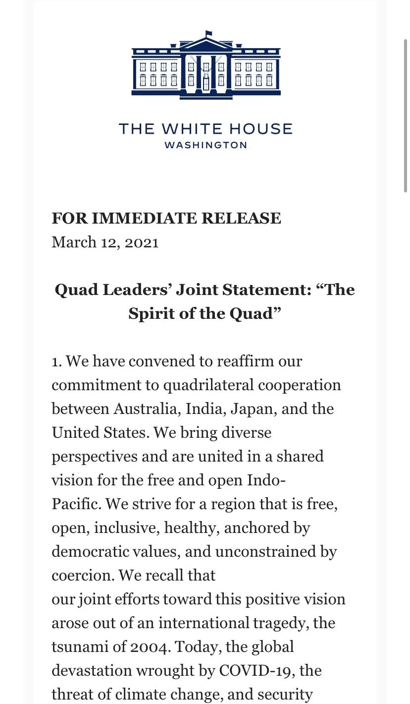 1. 重申对美日印澳四边合作的承诺,共同打造一个自由和开放的印太地区,并且承诺在全球面临严峻挑战之时加强合作。