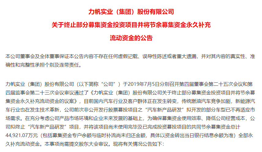 2019年7月5日,力帆股份发布了一份终止部分募集资金投资项目公告。该公告显示,力帆股份拟终止“汽车新产品研发”项目,该项目为力帆股份前期非公开发行股票的募集资金投资项目之一。但显然,力帆股份终止该项目目的不止于此,力帆股份在公告中表示,公司将该项目节余募集资金 4.49 亿元全部永久补充流动资金。