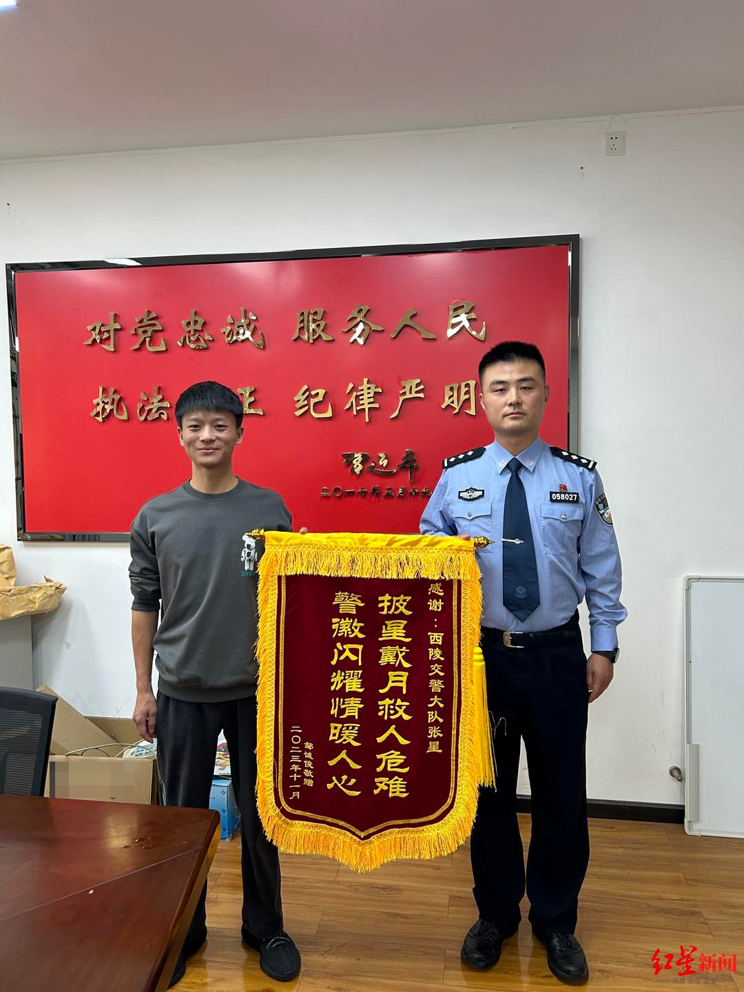 ▲深夜坚持要找到那个“消失的年轻人”,宜昌交警张星(右)接受邹诚俊送来的锦旗。
