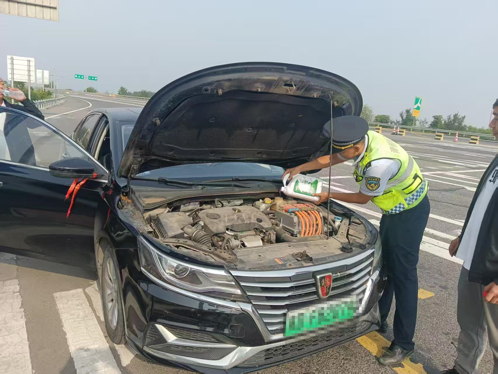 2025年9月3日上午8时许,一辆小轿车行驶至铜冶收费站时,因发动机过热“罢工”,停在收费广场。疏导员立即上前查看,发现仪表盘高温报警,冷却液已近“见底”,若不及时处理,恐严重影响后续行车安全。