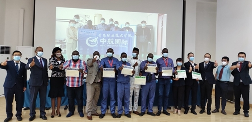 近日,青岛职业技术学院赴加蓬培训团顺利完成了为期12周的培训任务,在加蓬NKOK国际多领域职业培训和教育中心(简称CIMFEP)举行结业仪式。加蓬劳动和职业培训部职业培训和教育局总督学Frederic Otha Voula、劳动和职业培训部交流中心主任Teklaire Mekui Movono、中航国际成套设备有限公司加蓬分公司总经理徐华京、CIMFEP学校校长Jean Fidele Koumba等参加结业仪式,为学员颁发结业证书,并为青岛职业技术学院培训教师尹晓霞、李元超颁发荣誉证书。