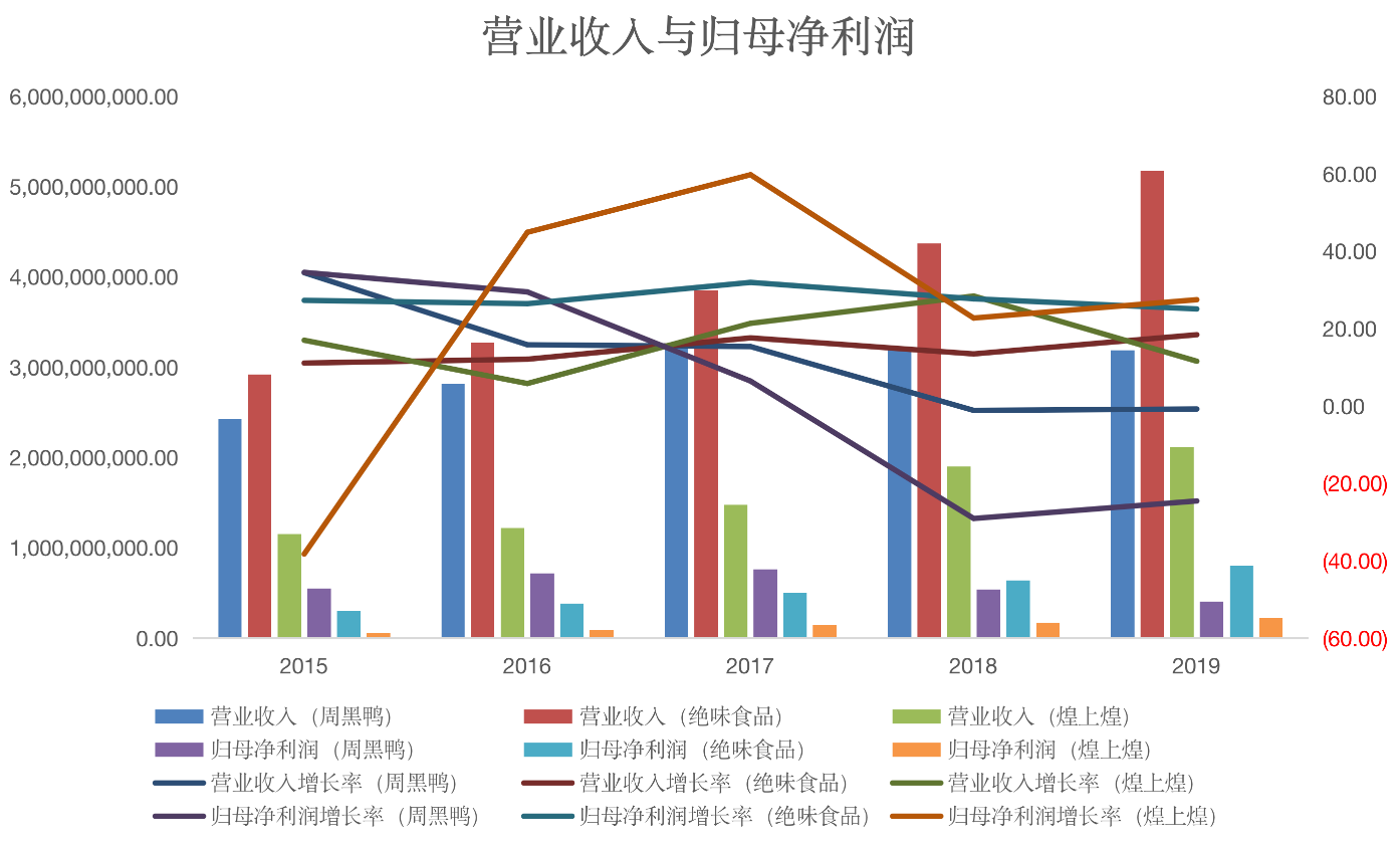 因此,众多加盟店的扩张模式让绝味食品成为行业龙头,2019年公司营业收入、净利润分别达到51.72亿、8.01亿,在门店形成规模效应之后,逐渐拉开与周黑鸭之间的差距。