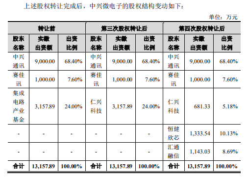 紧接着,中兴微电子在一个多月后发生了第二次股权变更。10月20日,仁兴科技以 14亿元价格向恒健欣芯转让中兴微电子10.1349%股权,以12亿元价格向汇通融信转让中兴微电子8.6870%股权。
