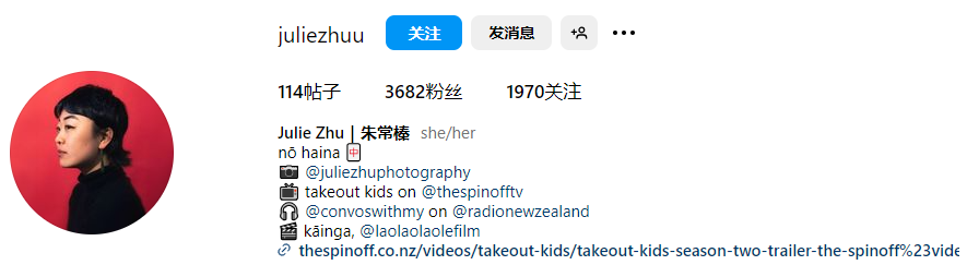 Julie是电影制作人、摄影师、播客主持人,致力于将新西兰的移民故事带到大众的视野中。