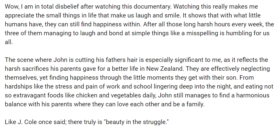 “当我看到John替爸爸理发的片段,完全被触动了。他的父母为了给他更好的生活来到新西兰,牺牲了很多。但仍然会被儿子做的一些小事感动。”