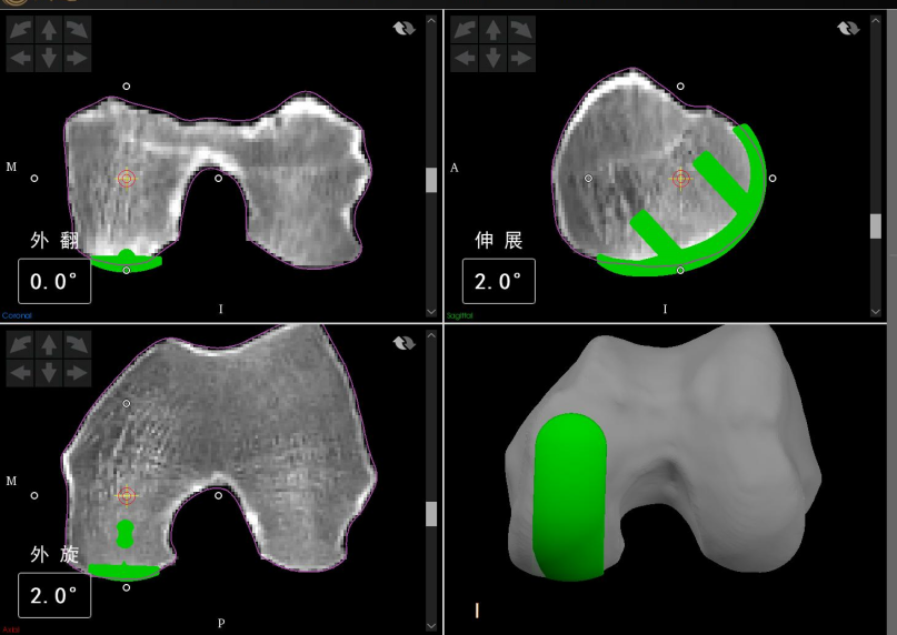 术前,骨科中心副主任、关节外科副主任张鹏带领关节外科单髁置换团队召开会议,进行详细术前规划:首先通过患者下肢CT扫描数据进行建模,通过三维和二维模型直观地识别患者解剖标志点,为患者精确确定假体型号和理想位置。