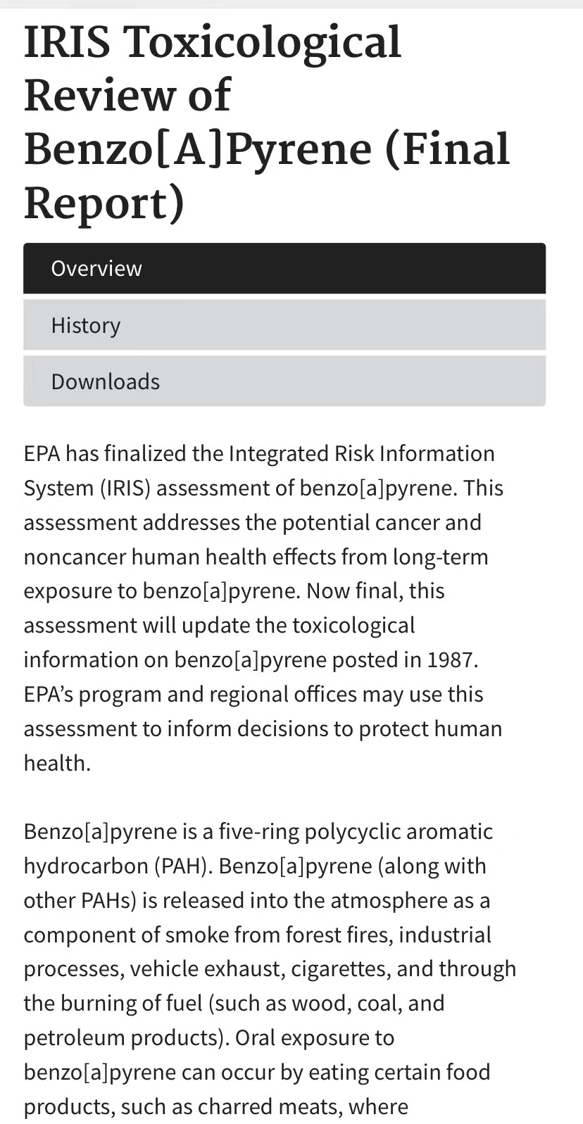 ▎ 2017年,美国环保局发布苯并芘毒理学审查,对多种动物物种的研究表明,苯并芘通过所有接触途径易在多个肿瘤部位(消化道、肝脏、肾脏、呼吸道、咽部和皮肤)致癌。此外,有强有力的证据表明,接触含有苯并芘的多环芳烃混合物的职业具有致癌性,例如铝生产、扫烟囱、煤气化、煤焦油蒸馏、焦炭生产、钢铁铸造、铺路等。越来越多的职业研究表明,累积苯并芘暴露与肺癌之间存在正暴露—反应关系。