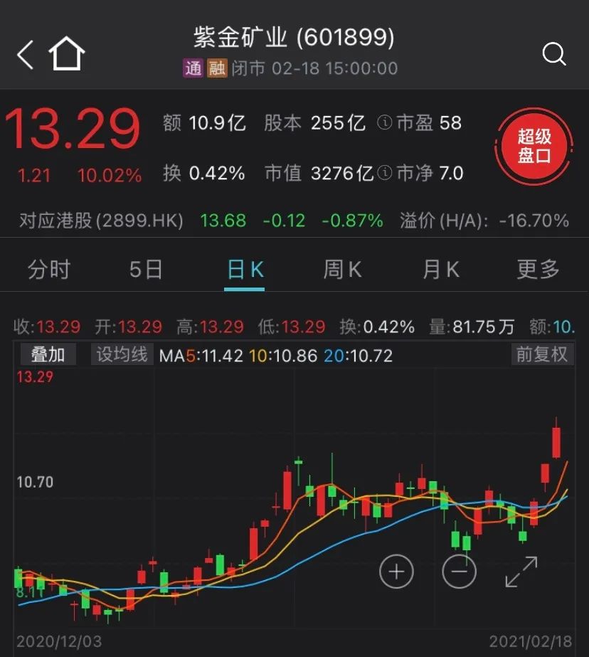 2月18日,有色板块龙头紫金矿业,全天一字板涨停,股价再创历史新高,总市值突破3200亿元。