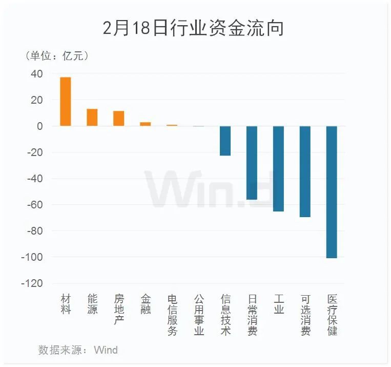 从2月18日行业资金流向来看,主力资金净流出200多亿元,其中医疗保健板块净流出额超过100亿元,位居首位;可选消费、工业、日常消费板块净流出金额均超过50亿元。而材料板块净流入30多亿元,能源、房地产等板块亦小幅净流出。
