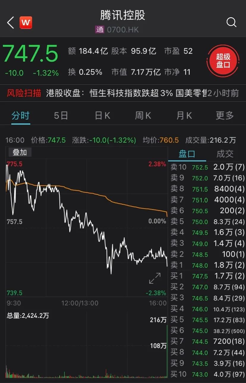 今天早盘,港股腾讯控股一度涨超2%,股价突破775港元刷新历史新高。然而午后,腾讯不断震荡回落,最终收跌1.32%,日内跌幅超3%。最新股价747.5港元,市值7.17万亿港元。美团从早盘大涨2%创新高,到暴跌5%。截至收盘,美团收跌5.18%。快手则一度暴跌超6%。截至收盘,收跌5.16%,最新市值为1.64万亿港元。