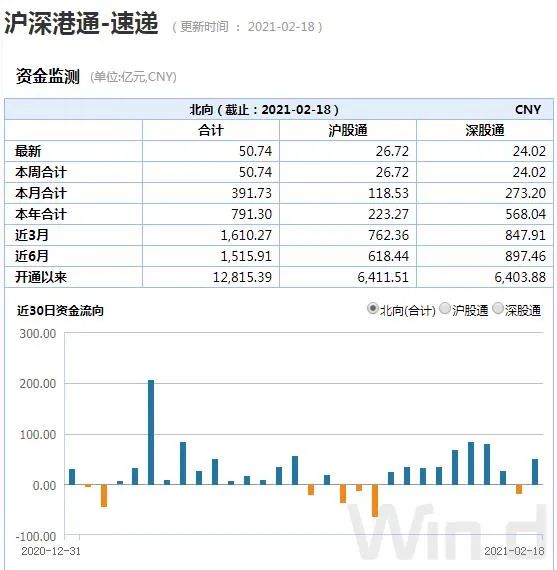 2月18日,北上资金净流入50.74亿元,本月净流入达391.73亿元。从近期北上资金变化趋势来看,除春节前一个交易日小幅净流出外,近期均保持流入态势。