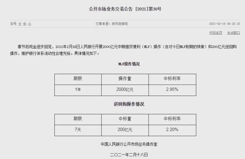 2月18日,央行发布公告称,春节后现金逐步回笼,开展2000亿元中期借贷便利(MLF)操作(含对今日MLF到期的续做)和200亿元逆回购操作,中标利率分别为2.95%、2.20%,维护银行体系流动性合理充裕。